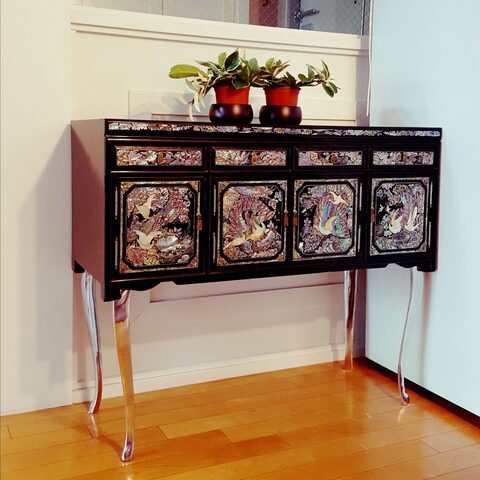 그분이 또 오셨어요. 고고하고 기품있는 찬란함!아름다운 우리의 것, 바로 자개 가구입니다.고객님께서 자개 옷장을 파티션과 식탁으로 리폼하고, 자개 문갑에 철제 다리를 부착하여 높이를 조정해 줄 것을 요청하셨습니다.그리고 문갑 위에 올려놓을 나무 상판도 주문해주셨습니다.