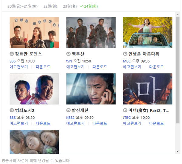 온 가족이 즐길 수 있는 코미디, 힐링과 숨 막히는 전개의 스릴러 영화로 설 연휴 마지막 날인 24일을 장식합니다. 2023년 설 특선영화 1월 24일 편성표는 SBS ‘장르맨 로맨스’ 오전 10시 30분 SBS ‘육사오’ 오후 8시 20분 KBS2 ‘발신제한’ 오후 9시 50분 jtbc ‘마녀2’ 오후 10시 KBS1 ‘세 자매’ 오후 10시 30분 오후 11시 20분 SBS ‘범죄도시2’ 오후 9시 등입니다.이상 설 연휴 TV 특선영화 편성표 라인업을 알려드렸습니다.